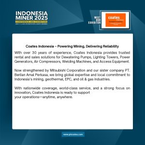 Coates Indonesia, as part of Mitsubishi Corporation, is proud to announce our participation in the Indonesia Miner Conference & Exhibition 2025!